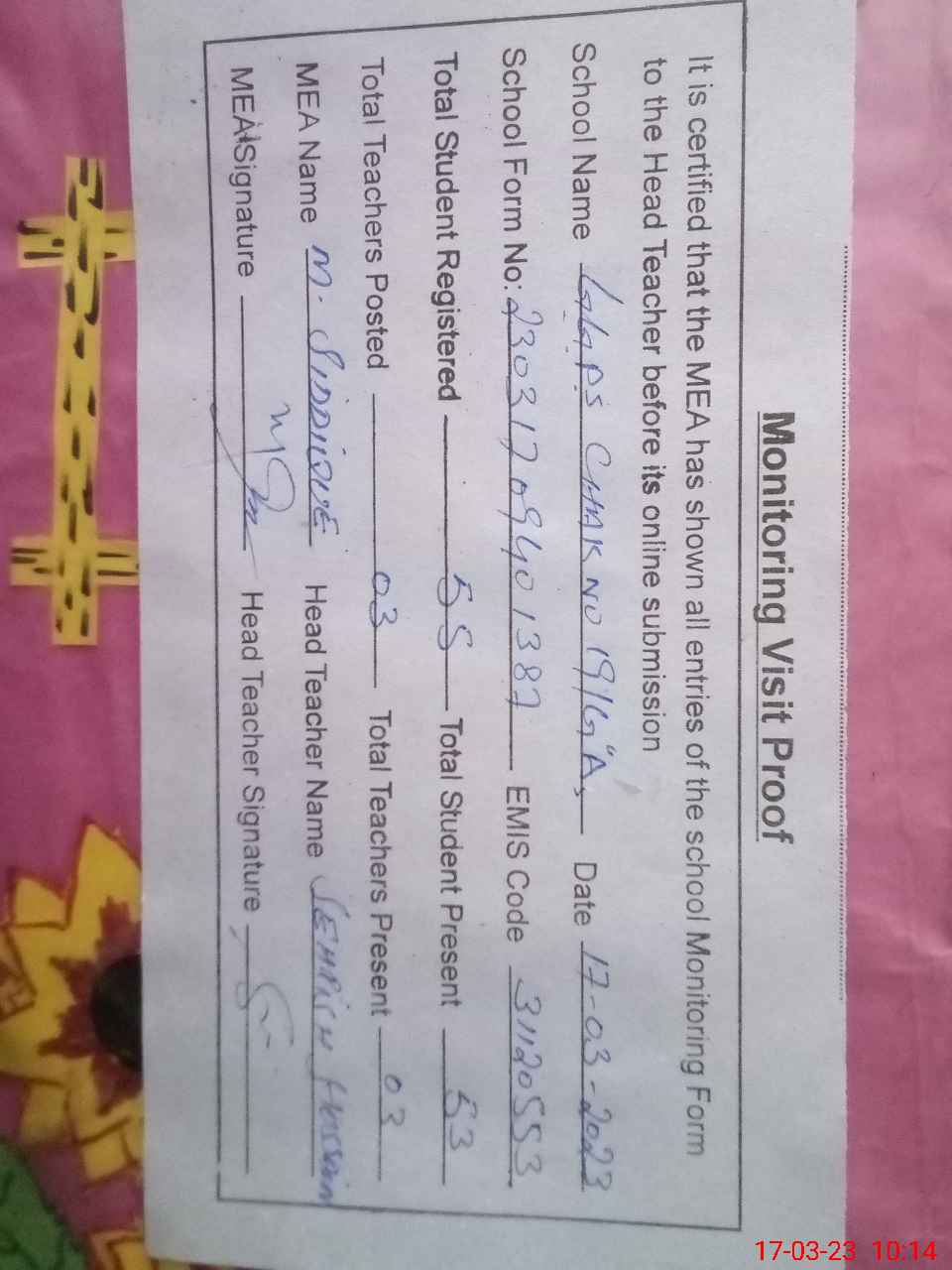 | Attendance Register | Head Teacher | MEA with School | Visit Proof |