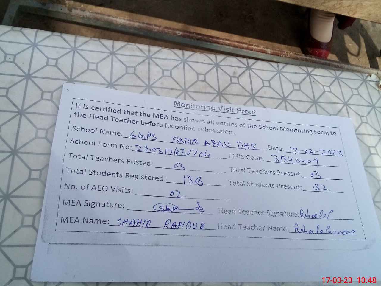 | Monitoring Date: 17-03-2023 | Start Time: 17-03-2023 10:20 AM | End Time: 17-03-2023 10:48 AM | Name of MEA: Sh**** Ra**** | |