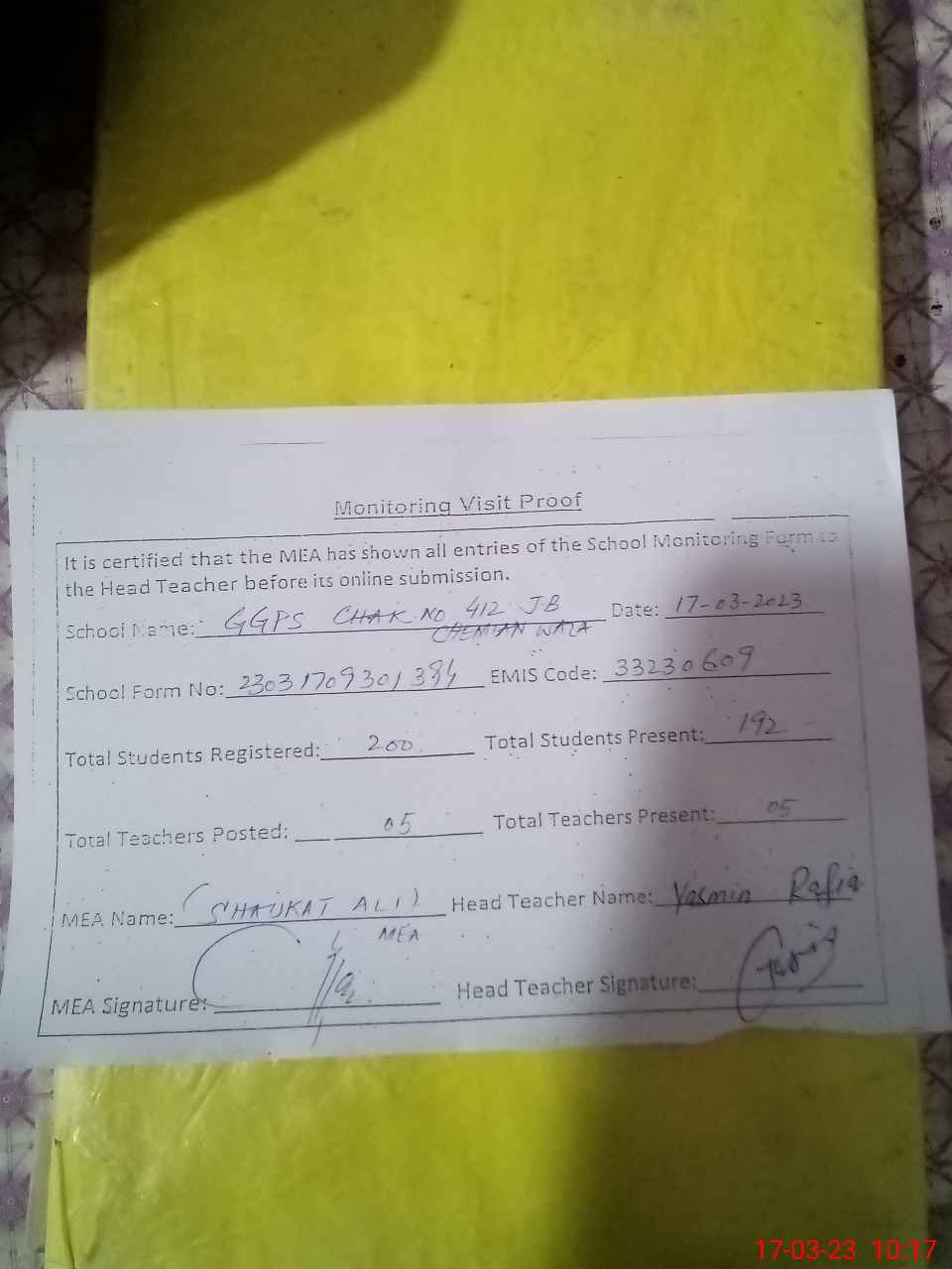 | Attendance Register | Head Teacher | MEA with School | Visit Proof |