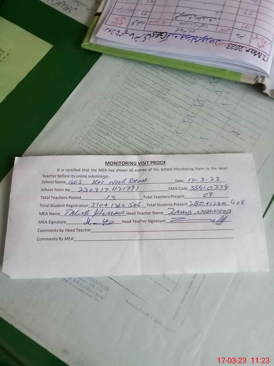 | Attendance Register | Head Teacher | MEA with School | Visit Proof |