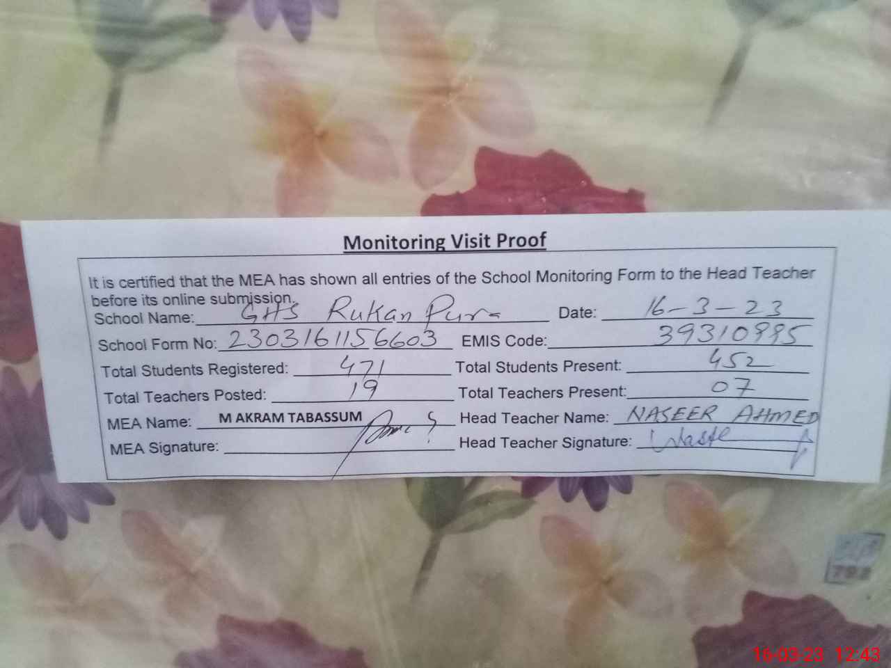 | EMIS Code: 39310995 | Name of School: GHS RUKAN PURA | |||