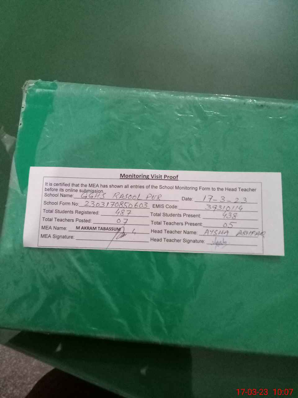 | EMIS Code: 39310114 | Name of School: GGHS RASOOL PUR | |||