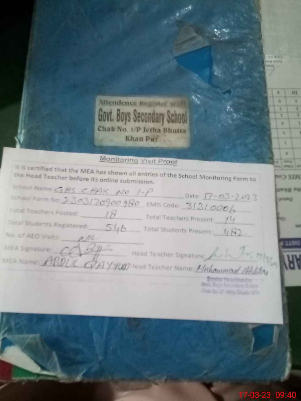 | Attendance Register | Head Teacher | MEA with School | Visit Proof |