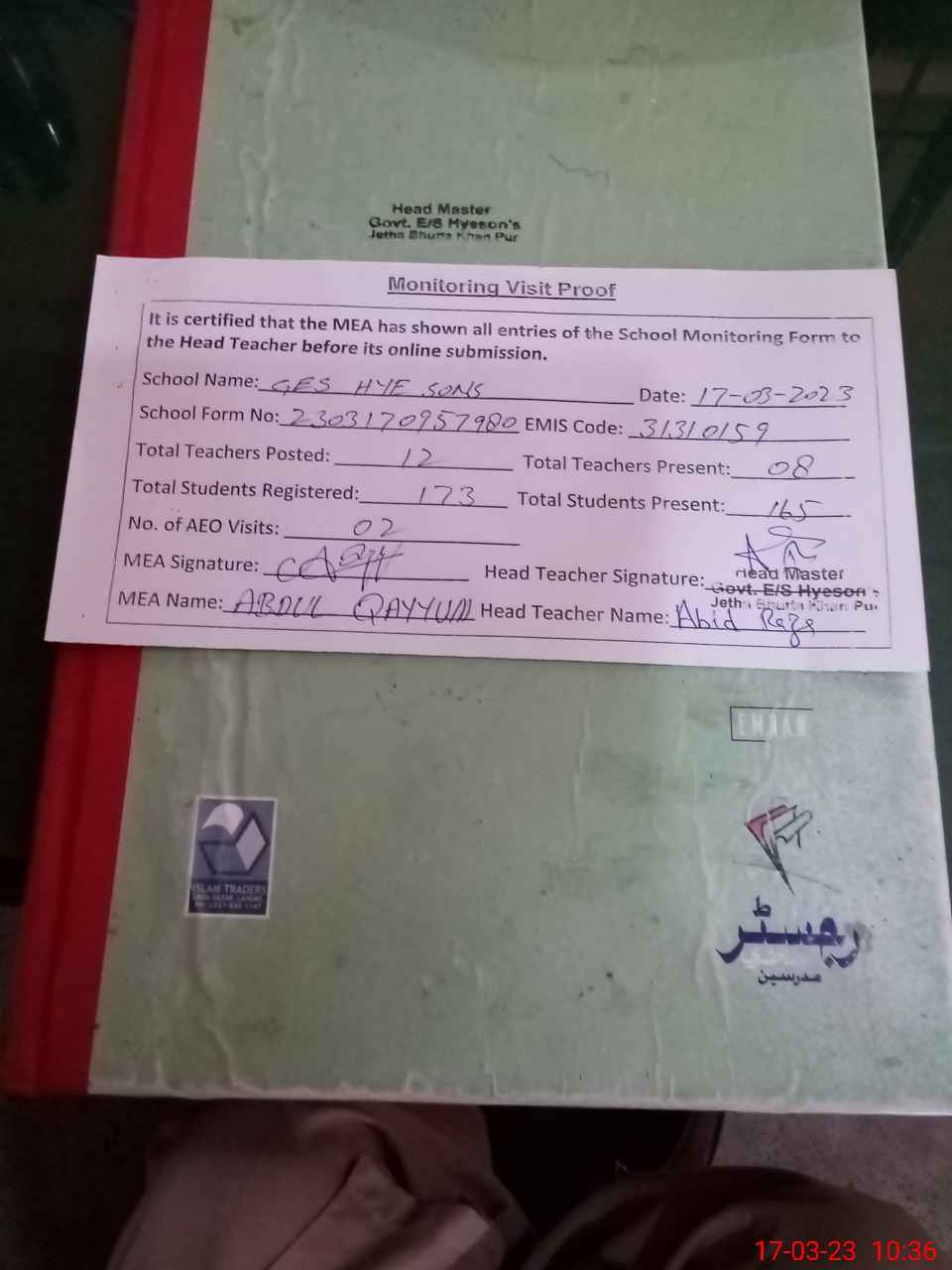 | Attendance Register | Head Teacher | MEA with School | Visit Proof |