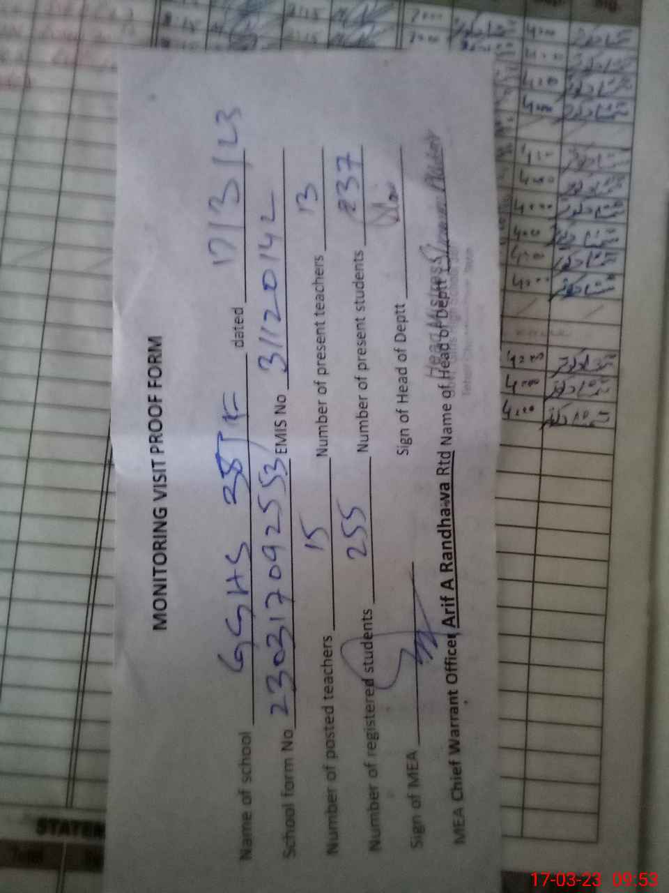 | Monitoring Date: 17-03-2023 | Start Time: 17-03-2023 09:25 AM | End Time: 17-03-2023 09:53 AM | Name of MEA: Ab**** Az**** Sh**** BN**** | |