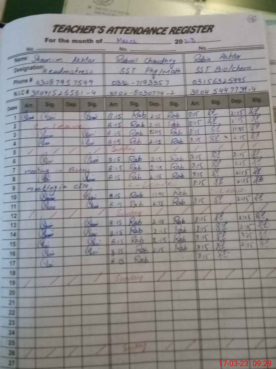 | CNIC | Full Name | Designation | R/C | Absence During Last Calender Month |