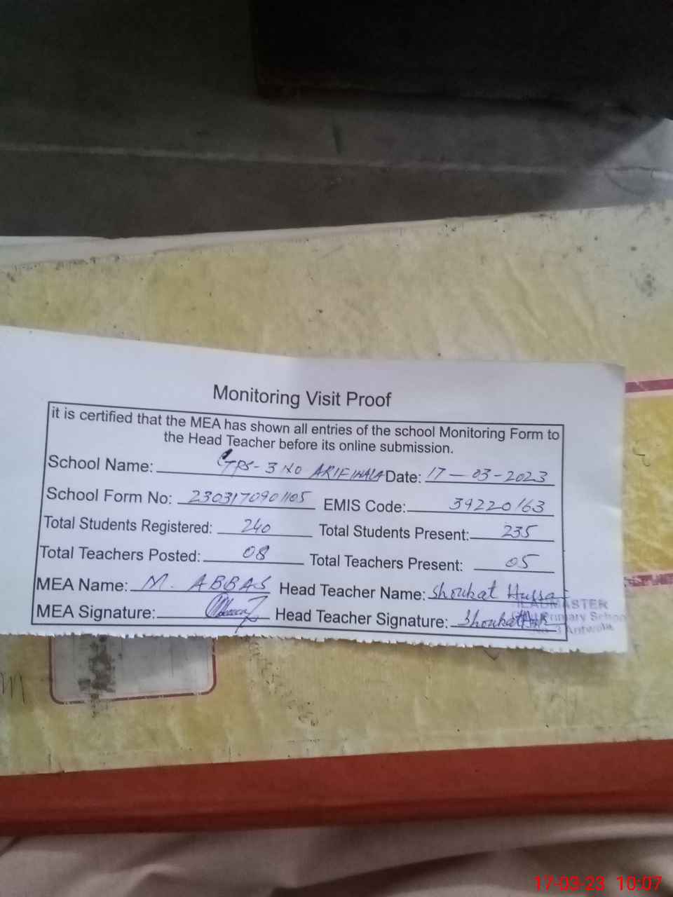 | Attendance Register | Head Teacher | MEA with School | Visit Proof |