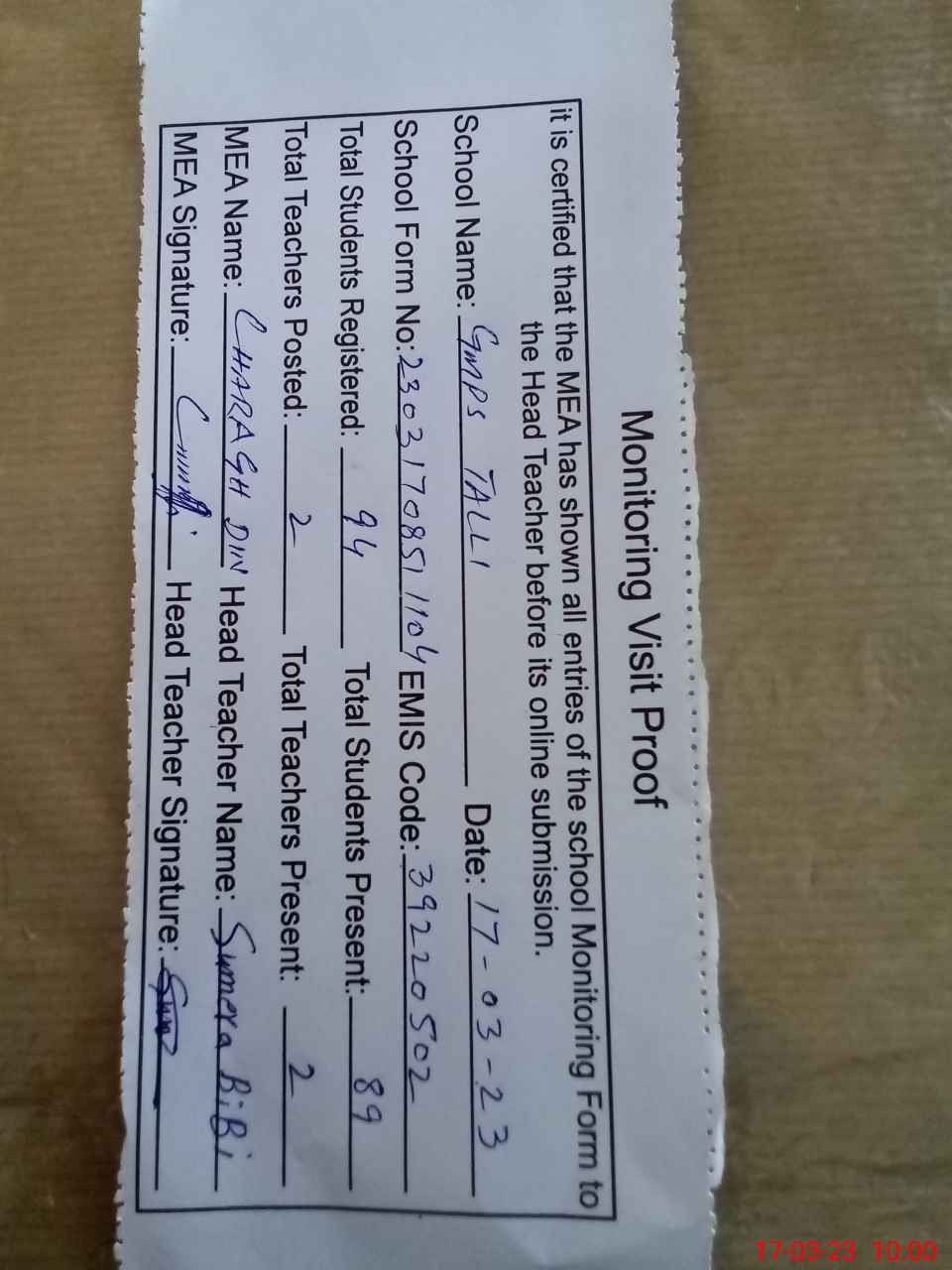 | EMIS Code: 39220502 | Name of School: GMPS MOZA TALLI | |||