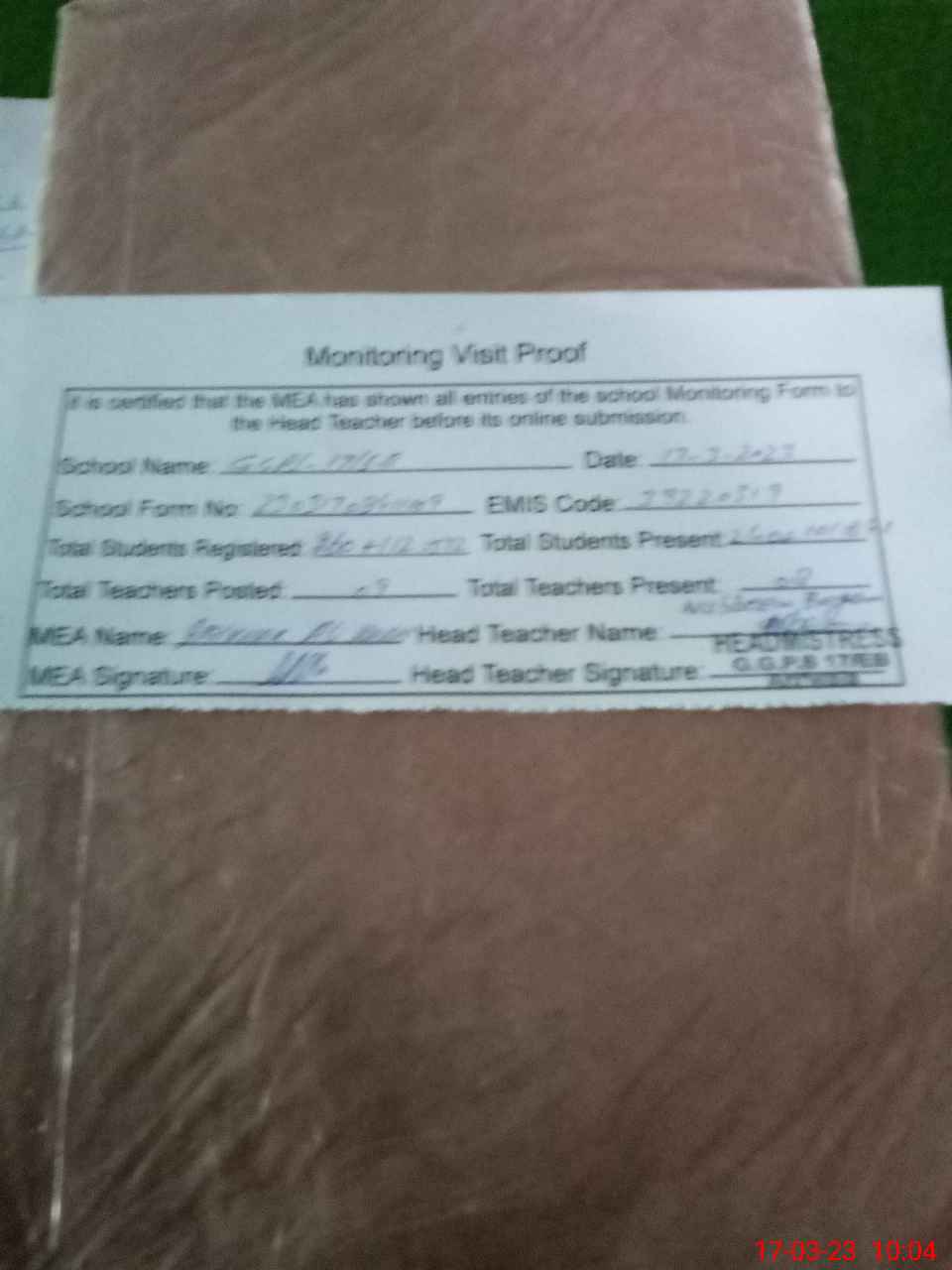 | Attendance Register | Head Teacher | MEA with School | Visit Proof |
