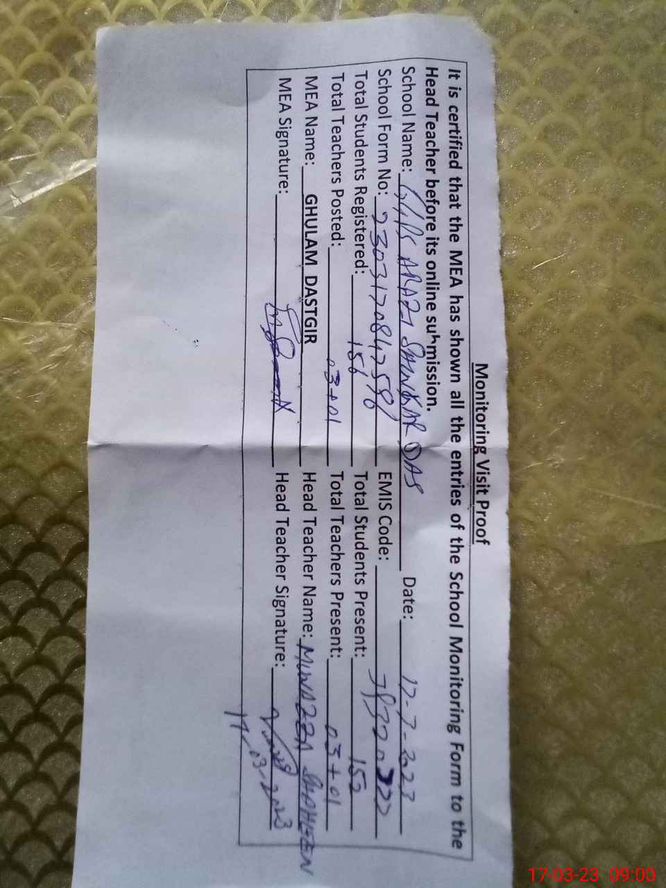 | Monitoring Date: 17-03-2023 | Start Time: 17-03-2023 08:31 AM | End Time: 17-03-2023 09:03 AM | Name of MEA: GH**** DA**** (R**** | |