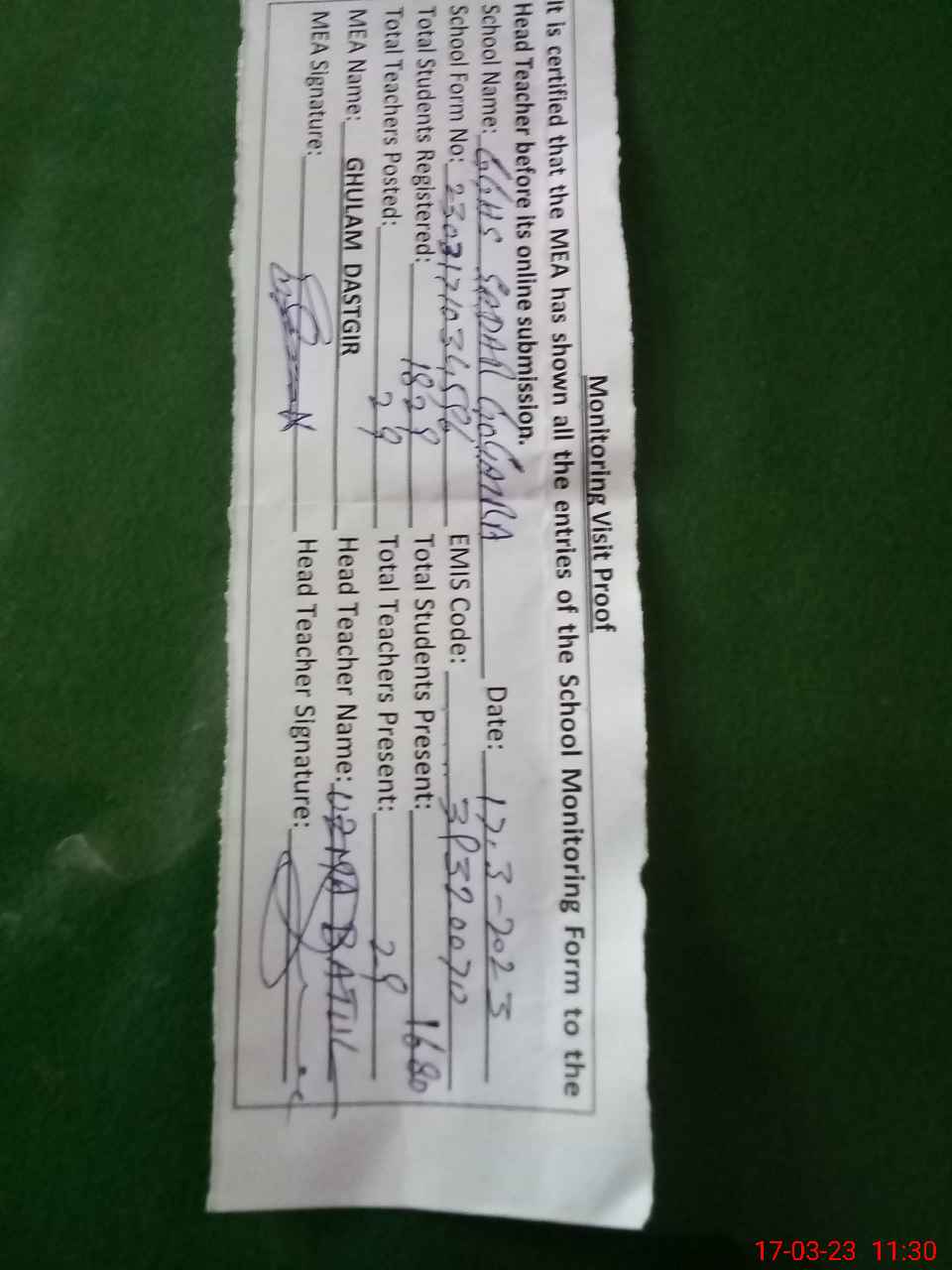 | Attendance Register | Head Teacher | MEA with School | Visit Proof |