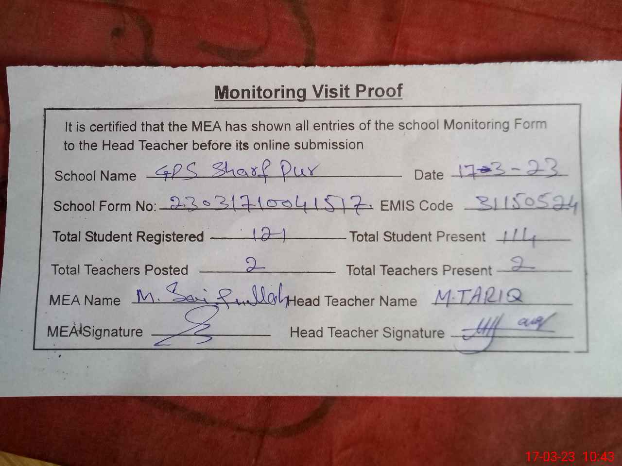 | EMIS Code: 31150524 | Name of School: GPS SHARAF PUR | |||