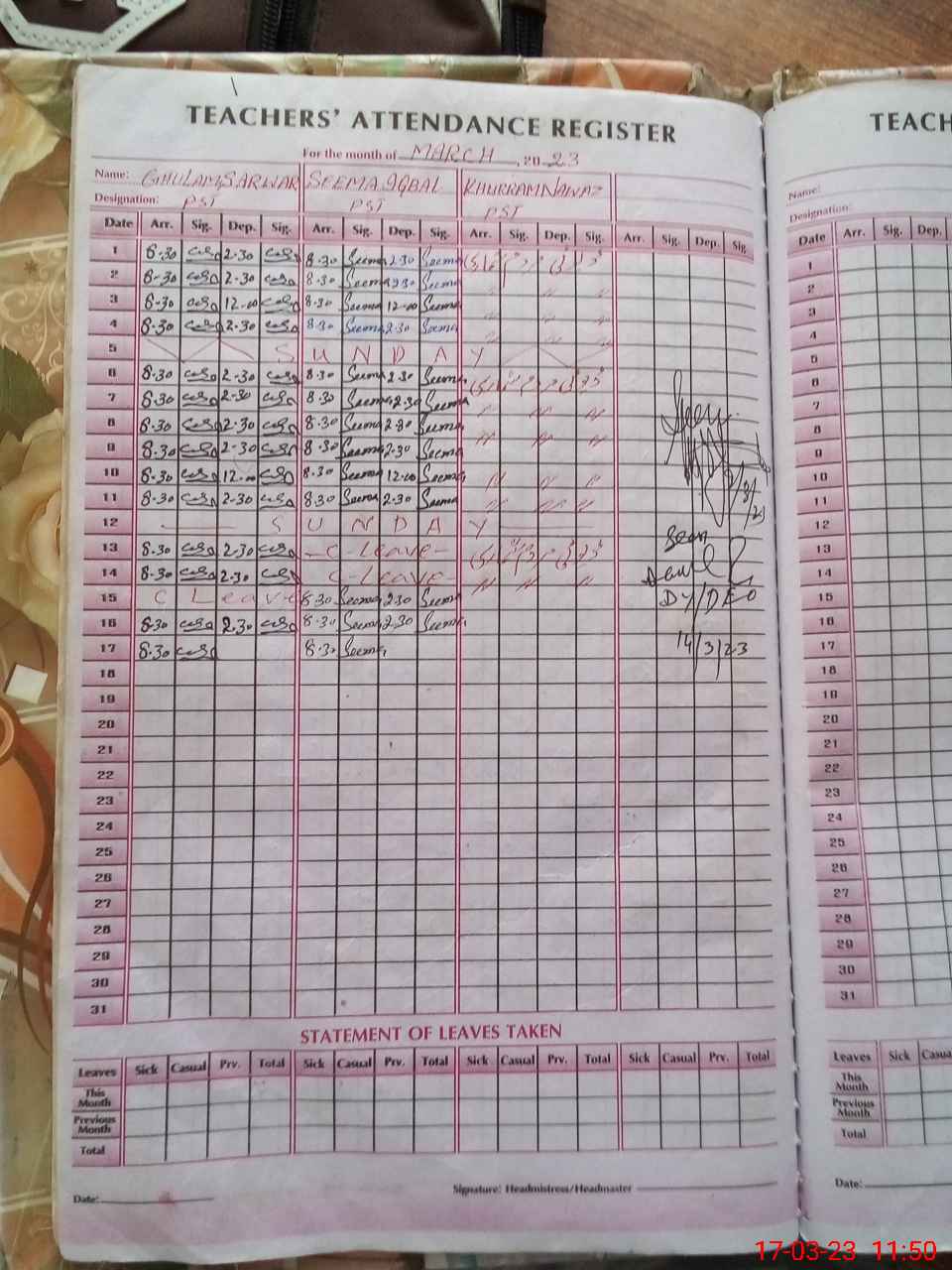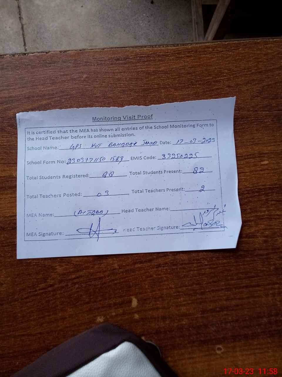 | Attendance Register | Head Teacher | MEA with School | Visit Proof |