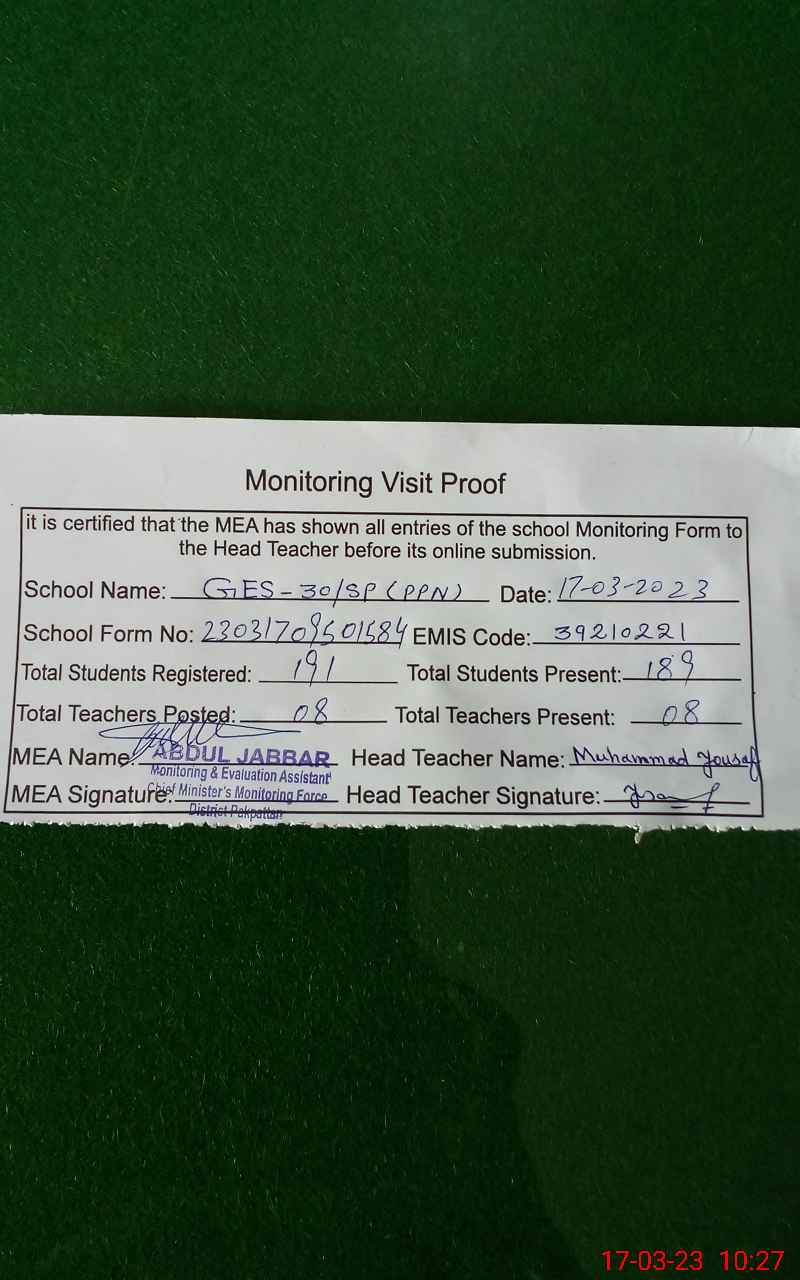 | EMIS Code: 39210221 | Name of School: GES CHAK NO. 30 SP | |||