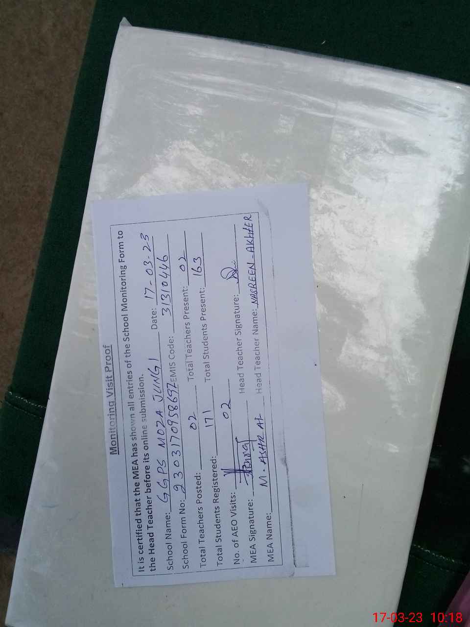 | Attendance Register | Head Teacher | MEA with School | Visit Proof |
