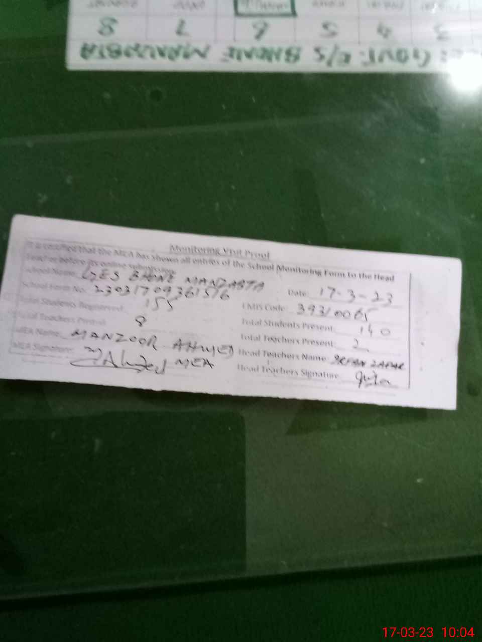 | Attendance Register | Head Teacher | MEA with School | Visit Proof |