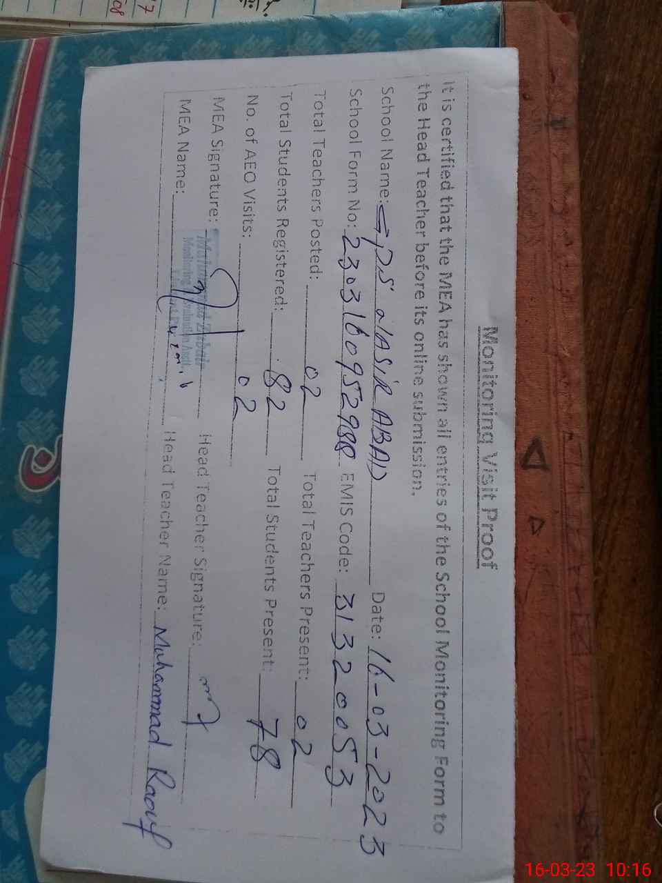 | Attendance Register | Head Teacher | MEA with School | Visit Proof |