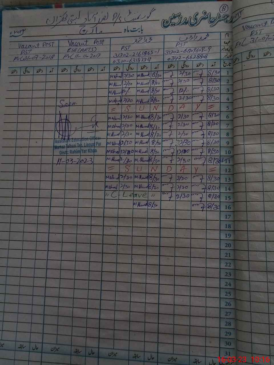 | Name: MU**** RA**** Designation: (School Headmaster's/Headmistress's) PST Phone/Cell Number: 03**** |