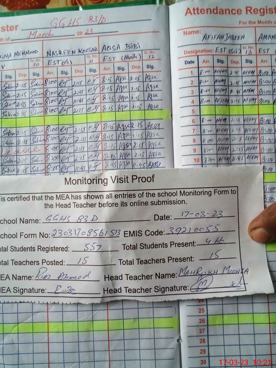 | Attendance Register | Head Teacher | MEA with School | Visit Proof |