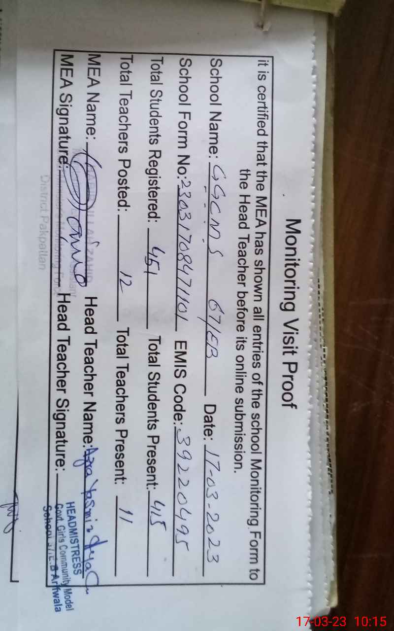| EMIS Code: 39220495 | Name of School: GGCMS CHAK NO. 67/EB | |||