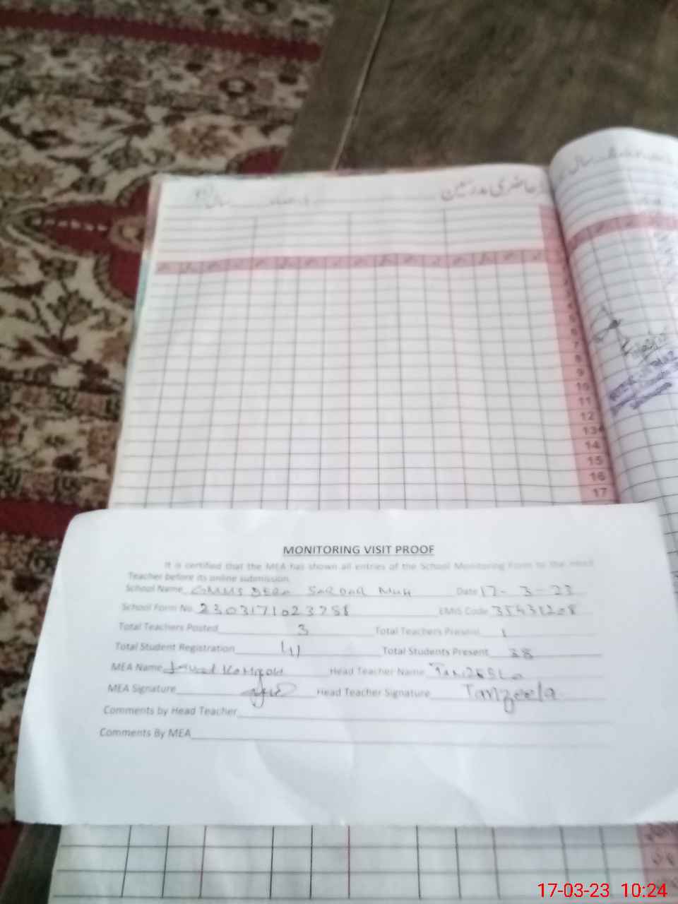 | Attendance Register | Head Teacher | MEA with School | Visit Proof |