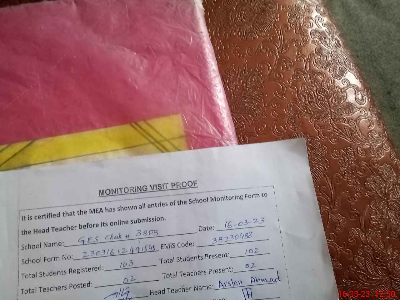 | EMIS Code: 38230488 | Name of School: GES CHAK NO. 38 DB | |||