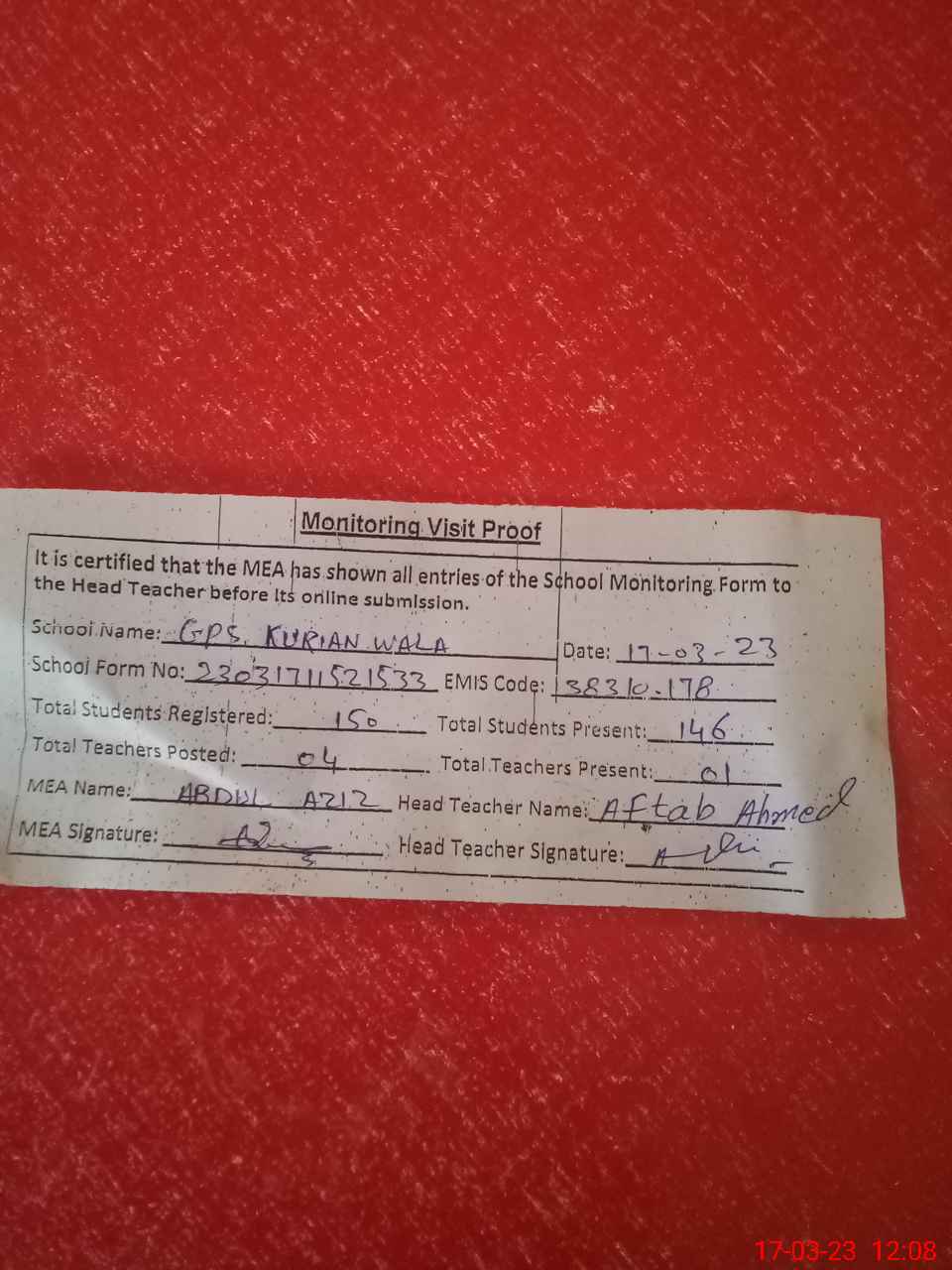 | Attendance Register | Head Teacher | MEA with School | Visit Proof |