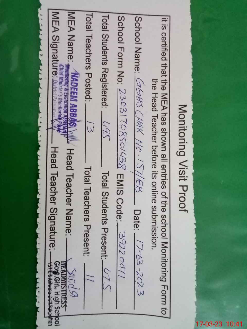 | EMIS Code: 39220071 | Name of School: GGHS CHAK NO. 157 EB | |||