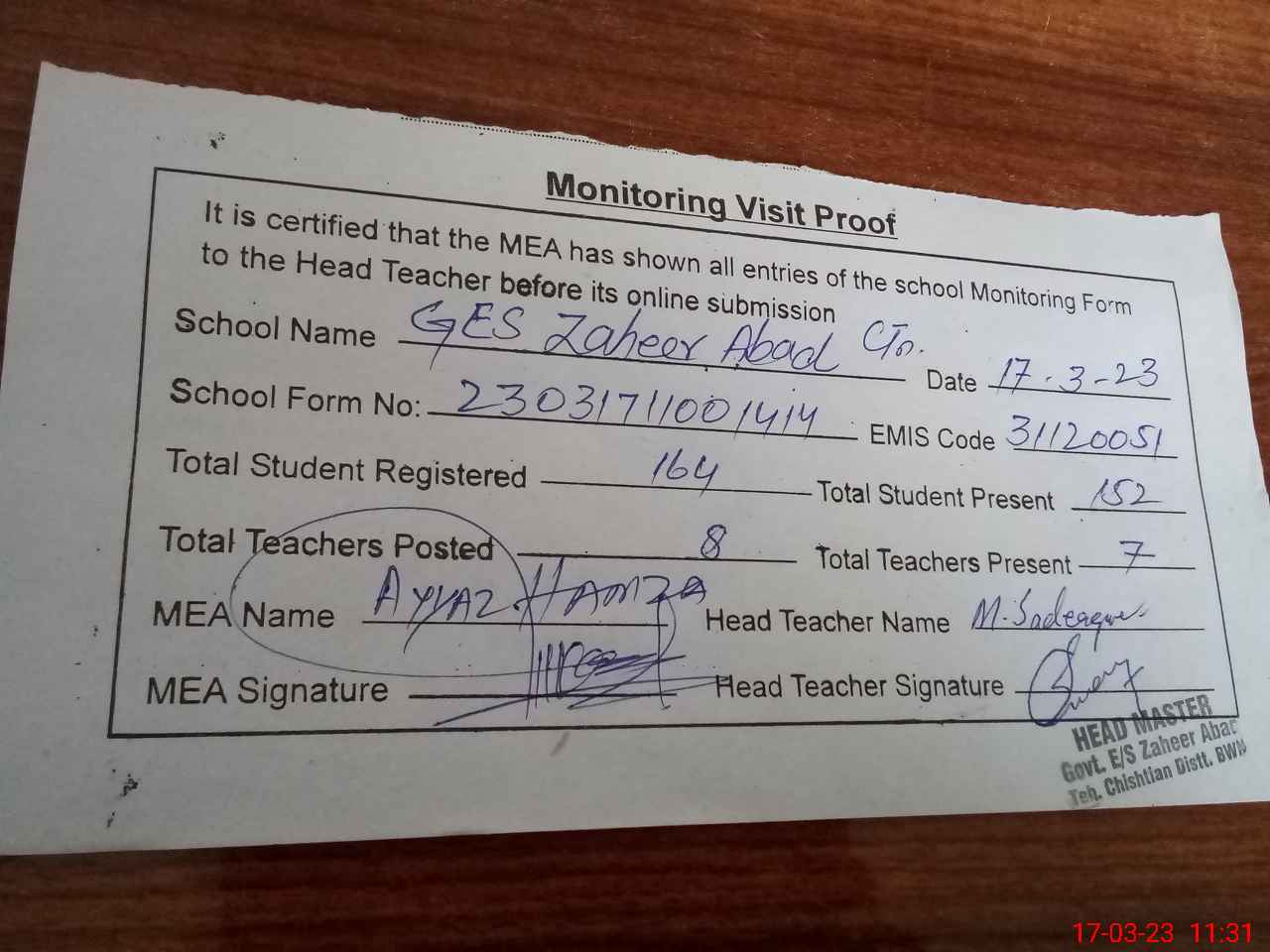 | EMIS Code: 31120051 | Name of School: GES ZAHEER ABAD CHISHTIAN | |||