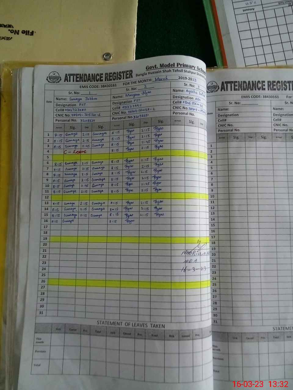 | CNIC | Full Name | Designation | R/C | Absence During Last Calender Month |