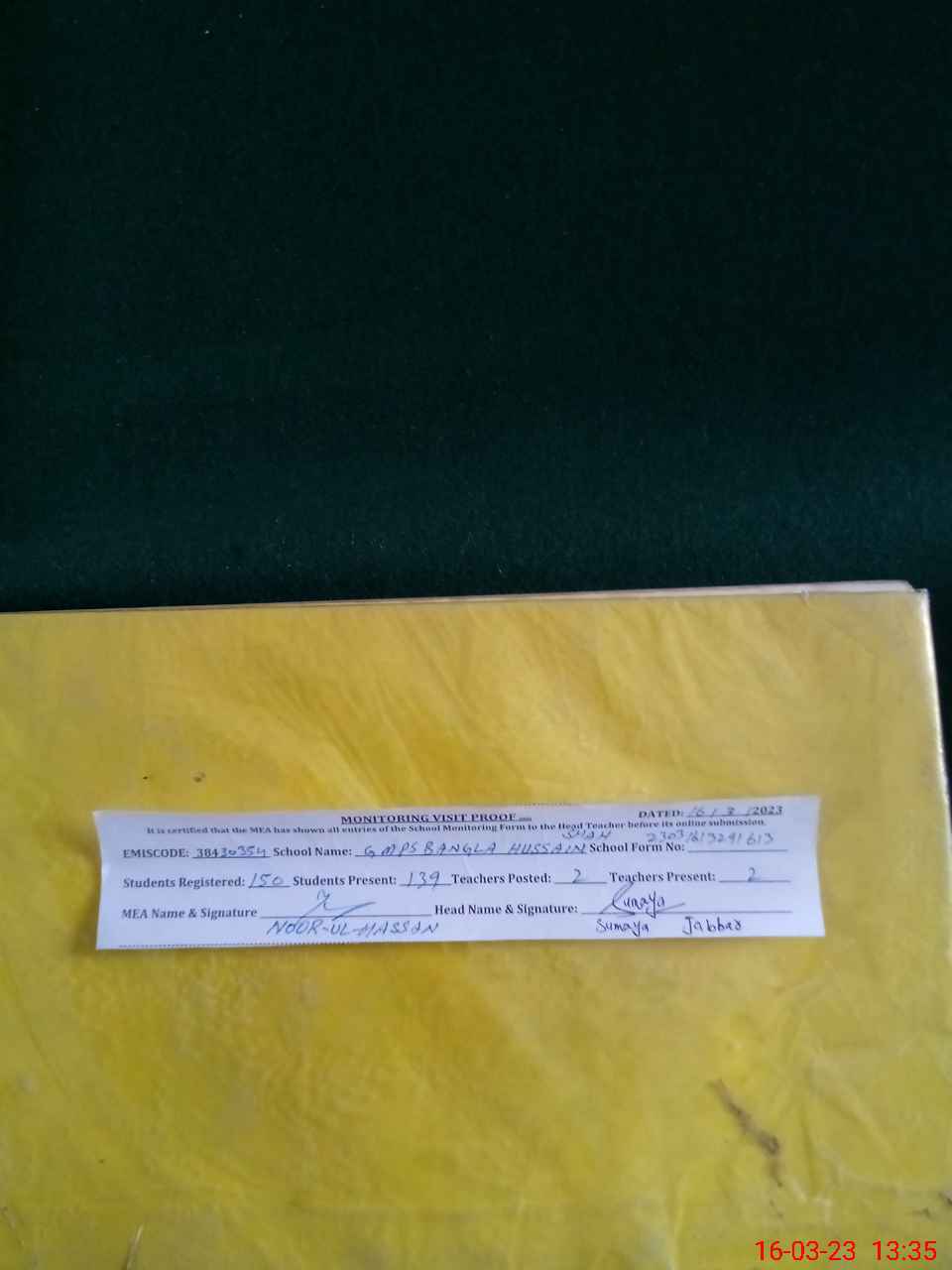 | Attendance Register | Head Teacher | MEA with School | Visit Proof |