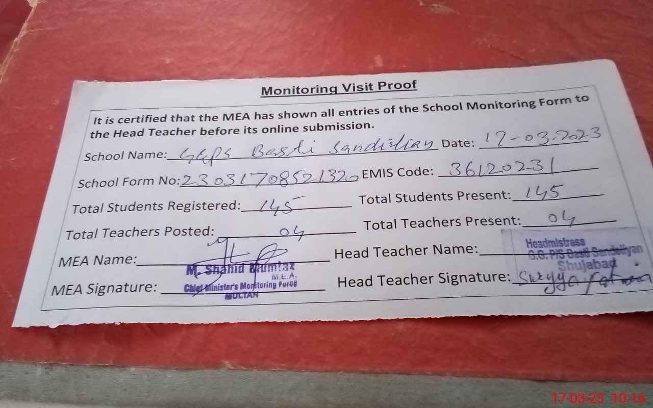 | EMIS Code: 36120231 | Name of School: GGPS BASTI SANDLIAN SHUJABAD | |||