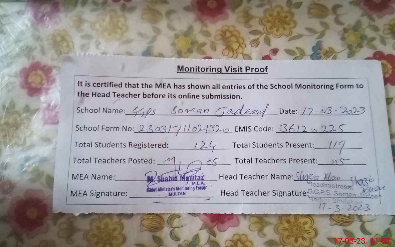 | EMIS Code: 36120225 | Name of School: GGPS SOMAN JADEED SHUJABAD | |||