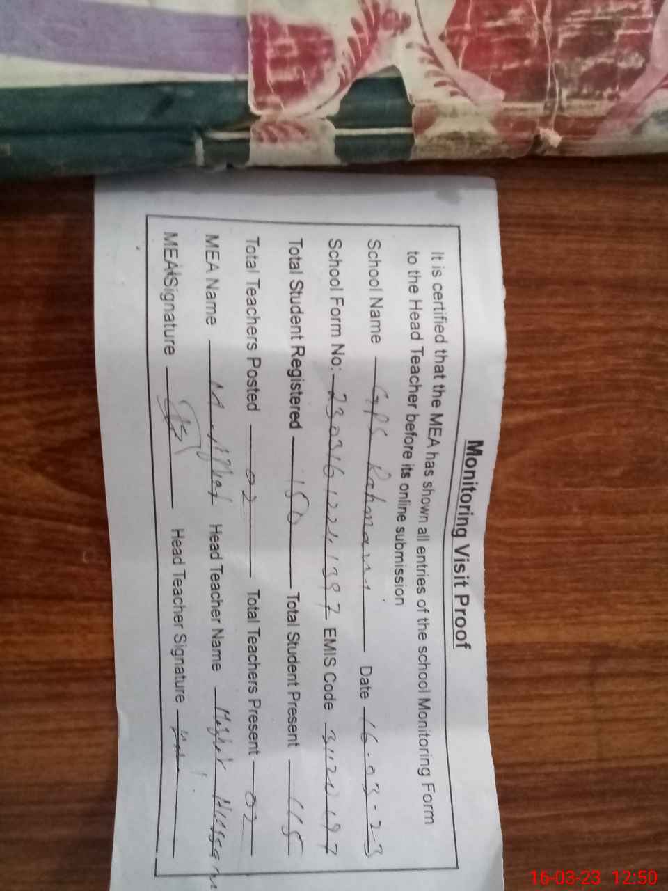 | Attendance Register | Head Teacher | MEA with School | Visit Proof |