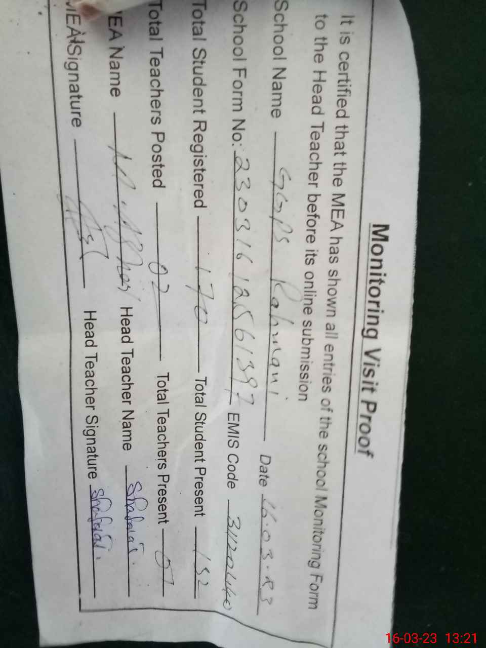 | Attendance Register | Head Teacher | MEA with School | Visit Proof |