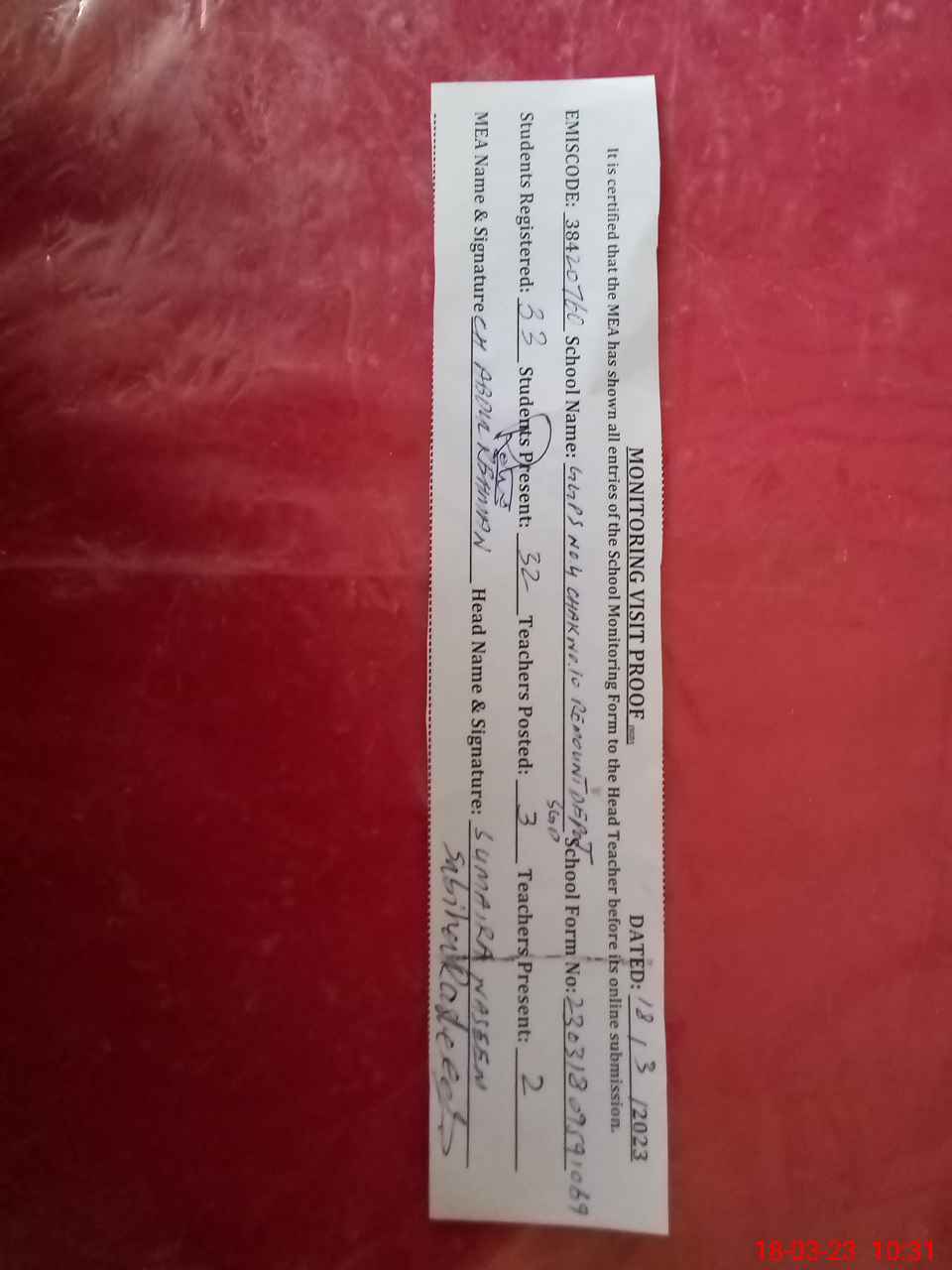 | Attendance Register | Head Teacher | MEA with School | Visit Proof |