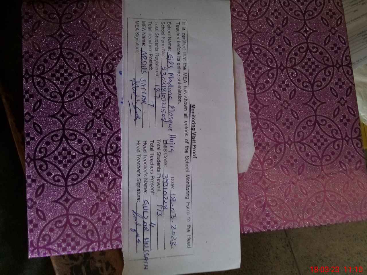 | Name: GU**** HU**** Designation: (School Headmaster's/Headmistress's) PST Phone/Cell Number: 03**** |