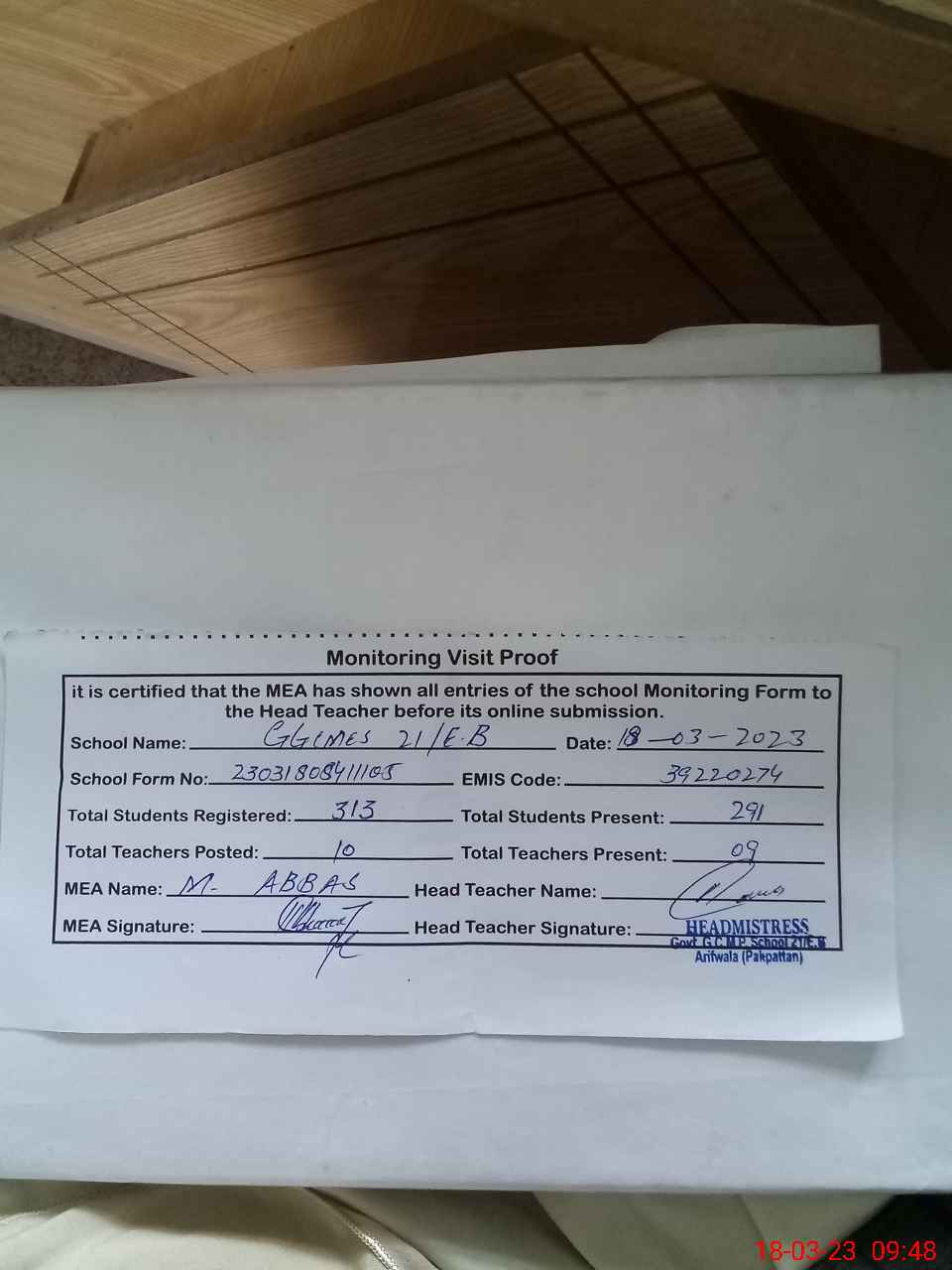 | Attendance Register | Head Teacher | MEA with School | Visit Proof |