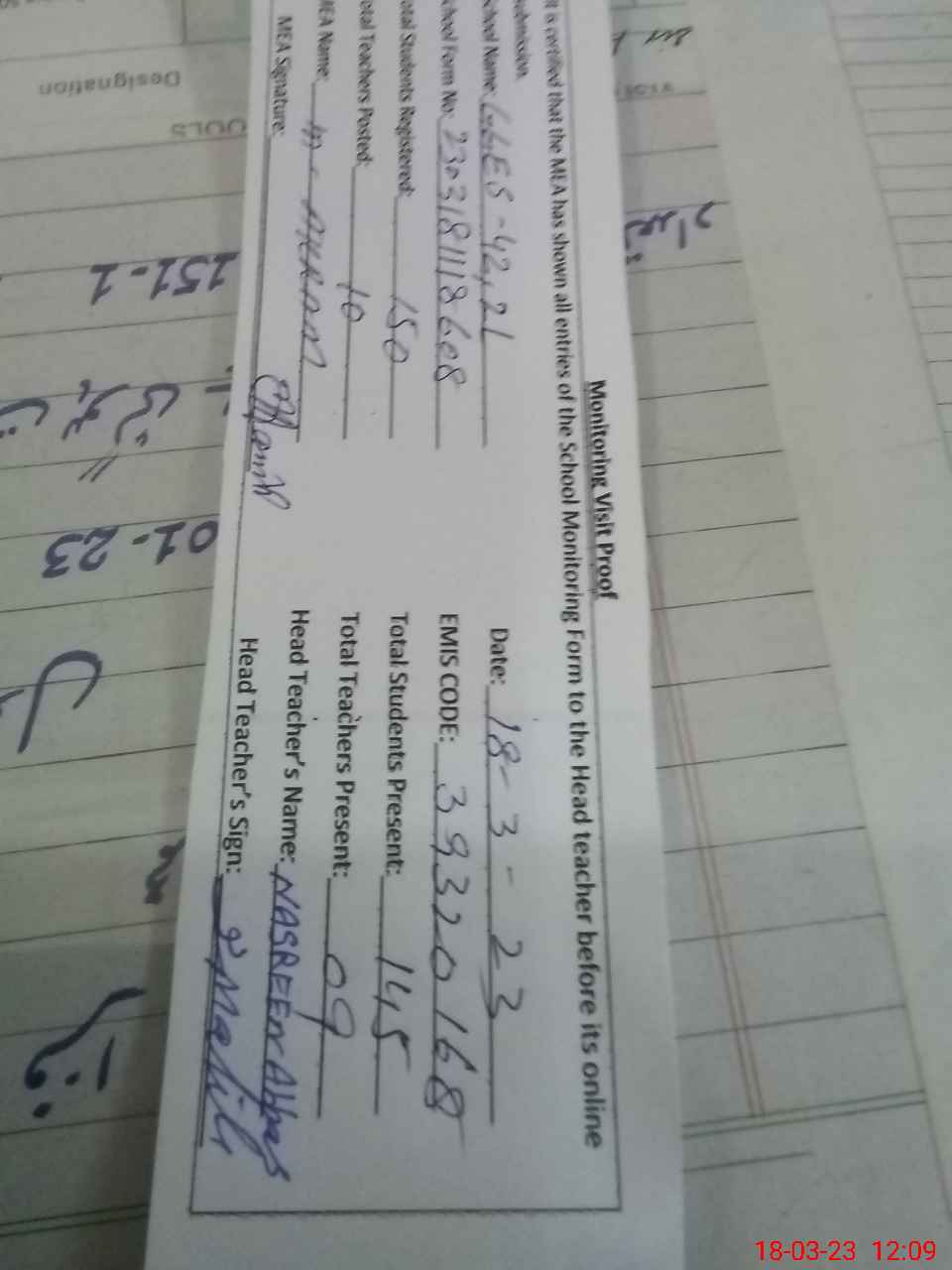 | Attendance Register | Head Teacher | MEA with School | Visit Proof |