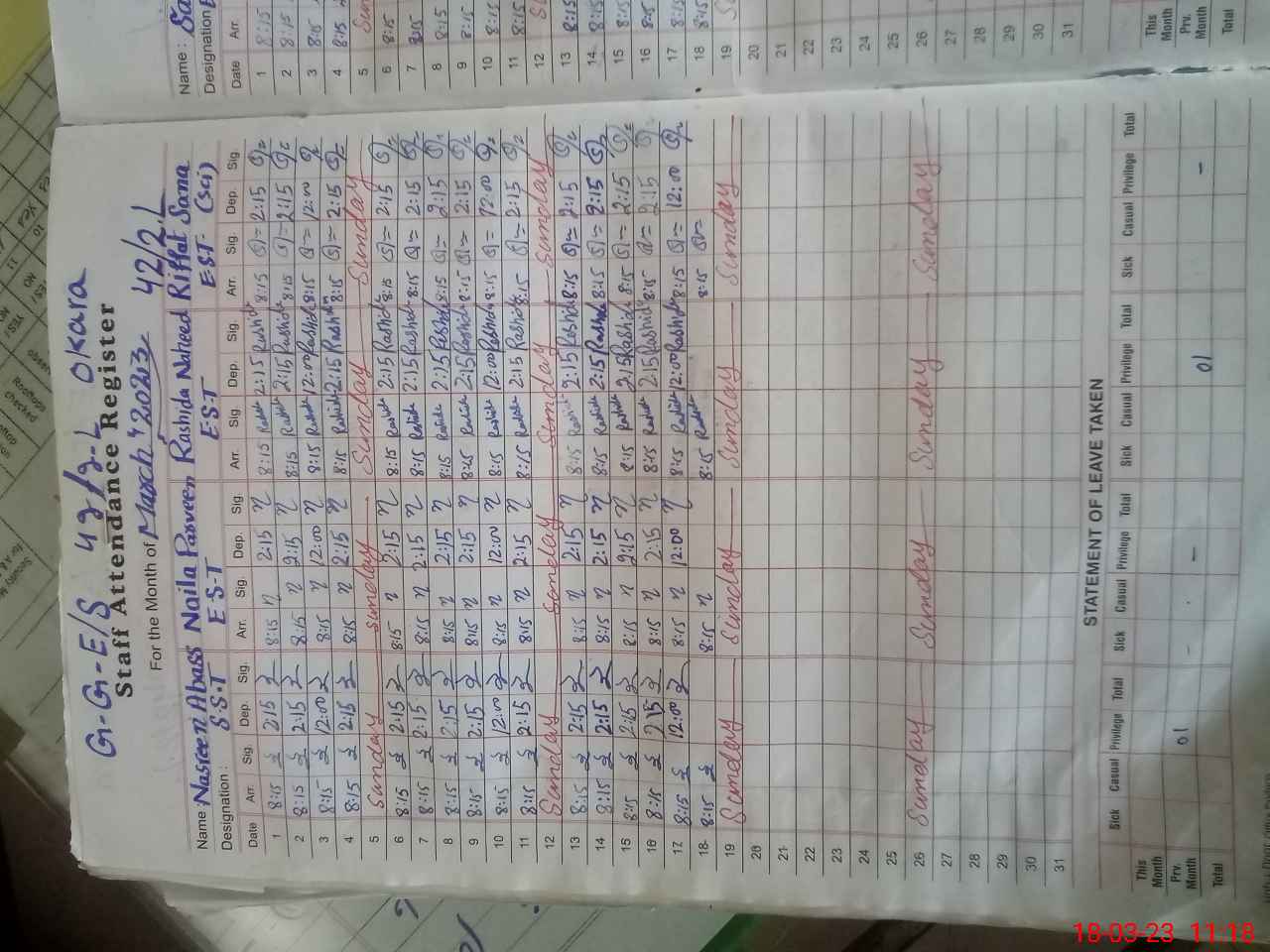 | CNIC | Full Name | Designation | R/C | Absence During Last Calender Month |