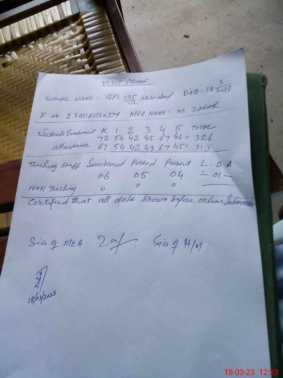 | Attendance Register | Head Teacher | MEA with School | Visit Proof |