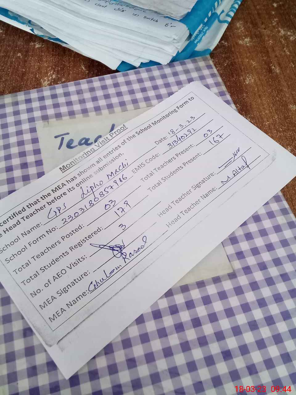 | Attendance Register | Head Teacher | MEA with School | Visit Proof |