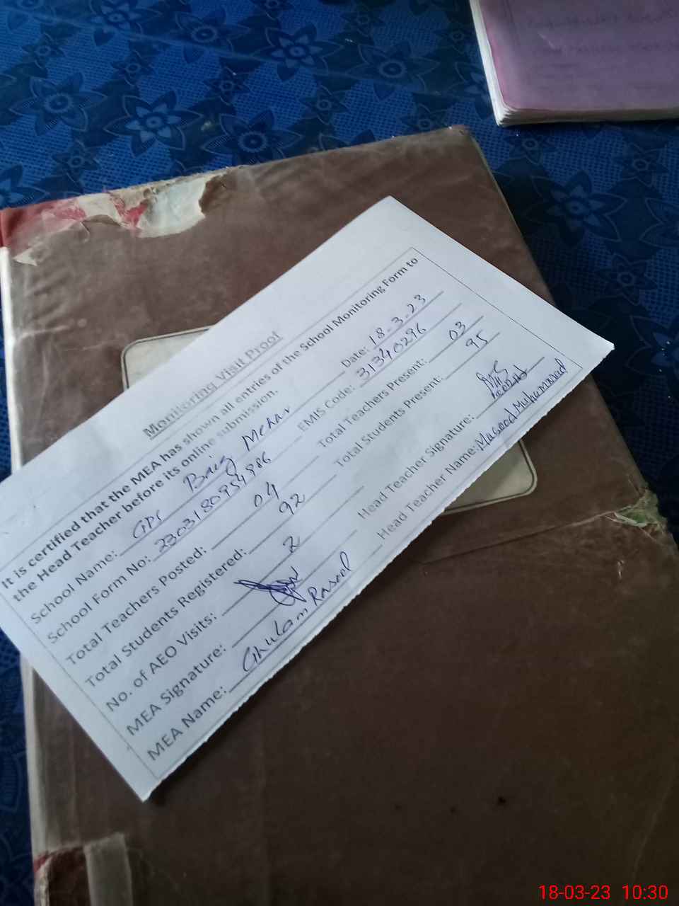 | EMIS Code: 31340296 | Name of School: GPS BAIG MEHAR | |||