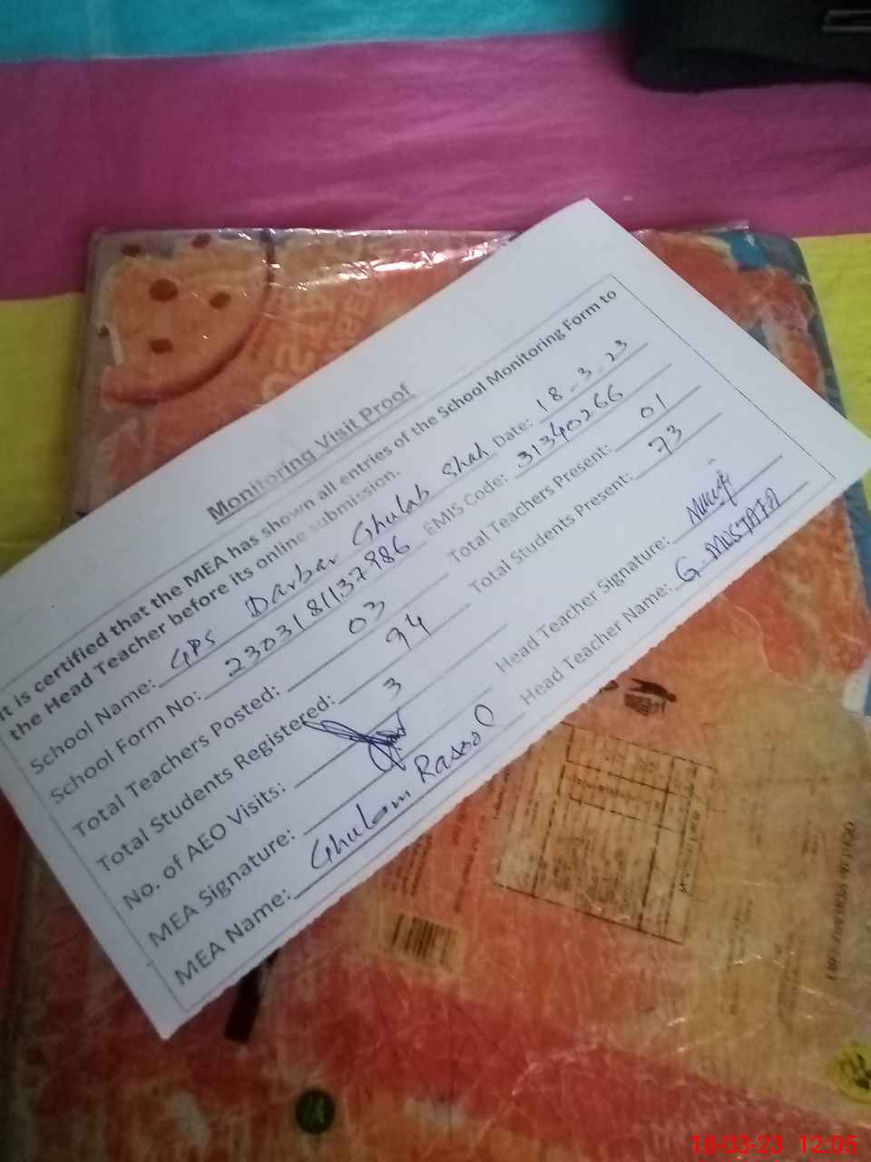 | Attendance Register | Head Teacher | MEA with School | Visit Proof |