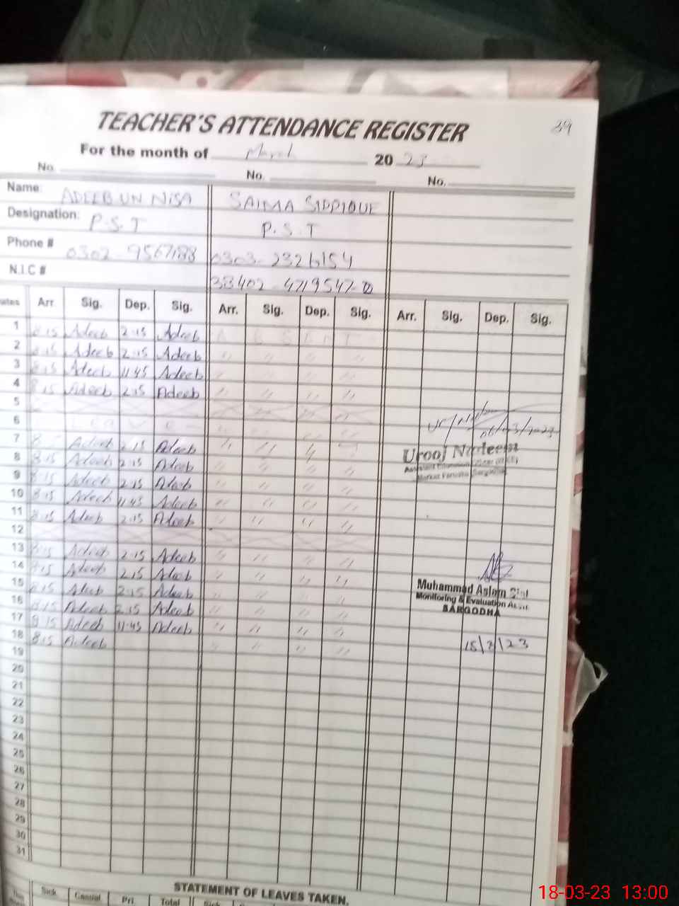 | Name: AA**** BA**** Designation: (School Headmaster's/Headmistress's) PST Phone/Cell Number: 03**** |