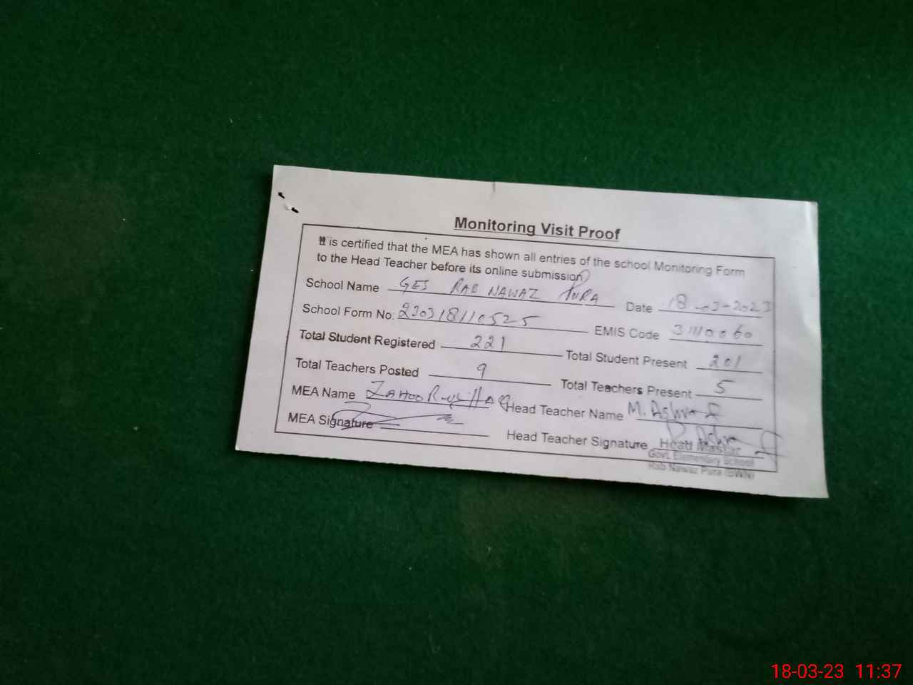 | Attendance Register | Head Teacher | MEA with School | Visit Proof |