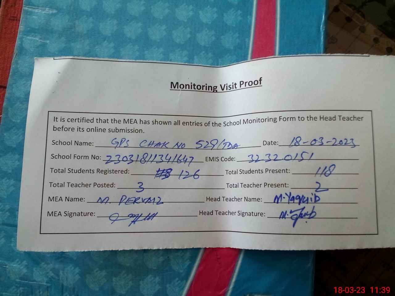 | Attendance Register | Head Teacher | MEA with School | Visit Proof |