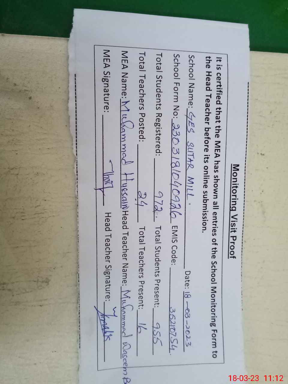 | EMIS Code: 35210754 | Name of School: GHS SUTAR MILLS TEHSIL SHALIMAR (Newly upgraded) | |||