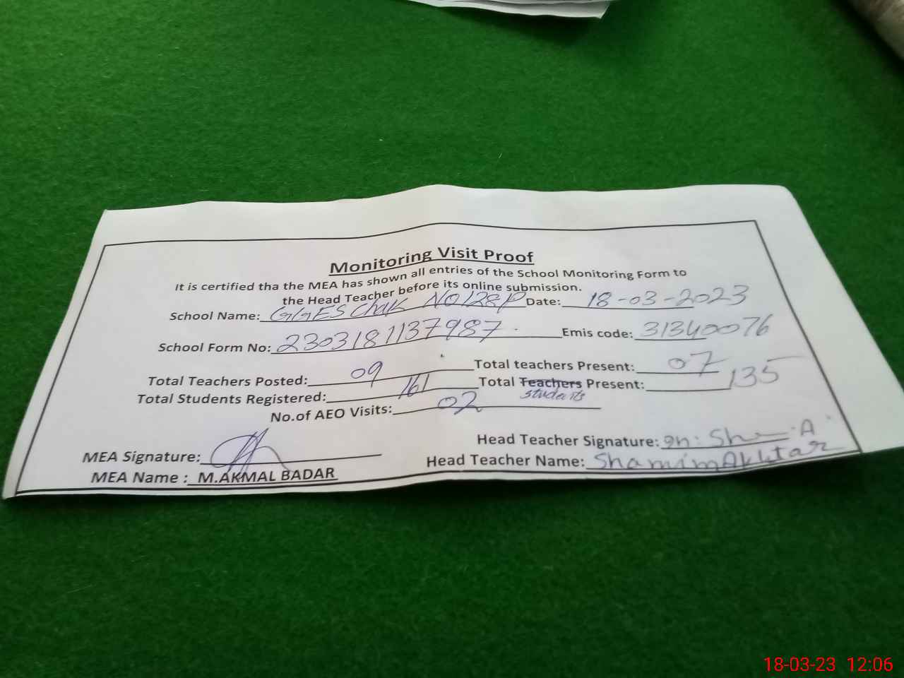 | Attendance Register | Head Teacher | MEA with School | Visit Proof |