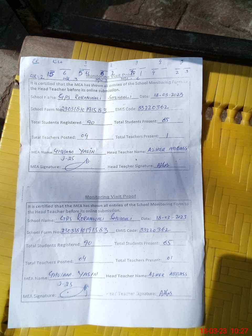 | Attendance Register | Head Teacher | MEA with School | Visit Proof |